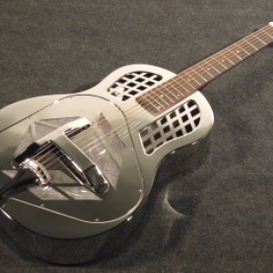 Body: Nickel-Plated Bell Brass - small body, cutaway Neck: Mahogany Fretboard: Rosewood Cone Material: Alumium Cone Brand: Single cone 9,5" Cone Size: 9.5" Coverplate: Bell Brass Headstock Overlay: N/A Tailpiece: Bell Brass Bridge: Hard Maple Position Markers M.O.P. Dot Tuners: Nickel Nut, Width: 44 mm Scale Length: 63,4cm