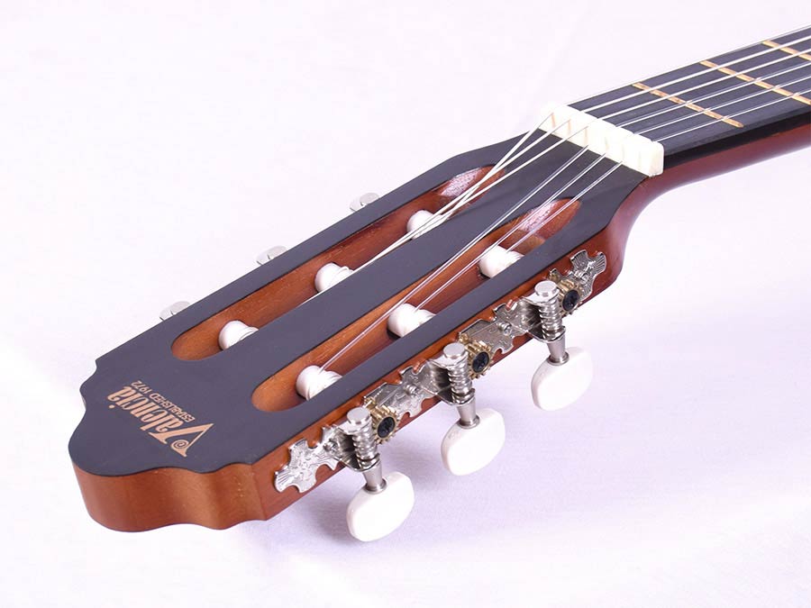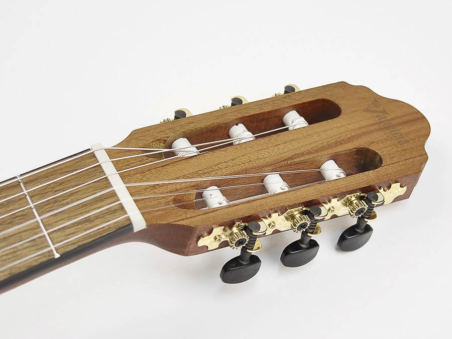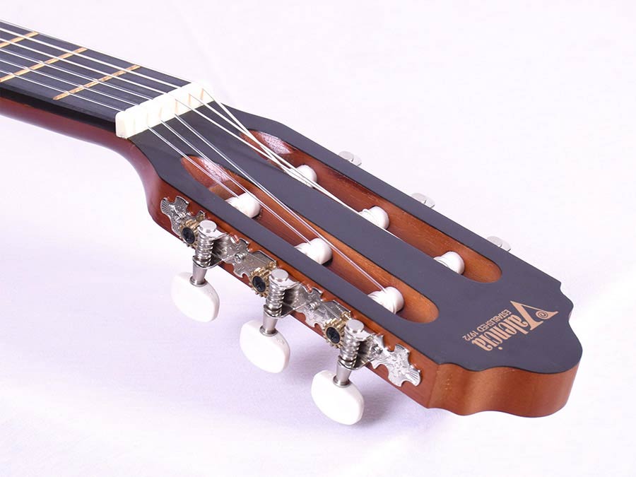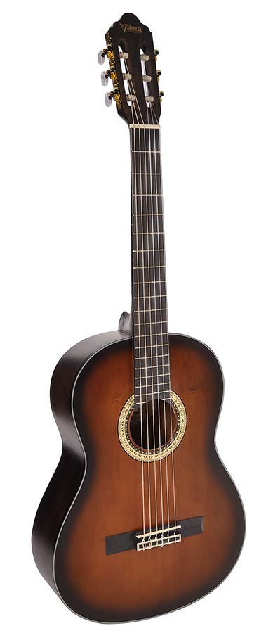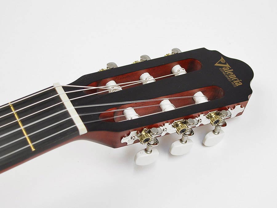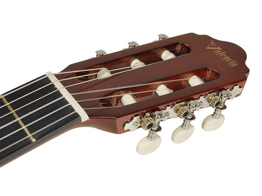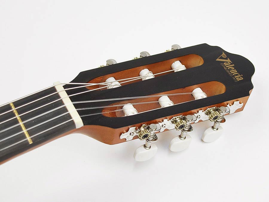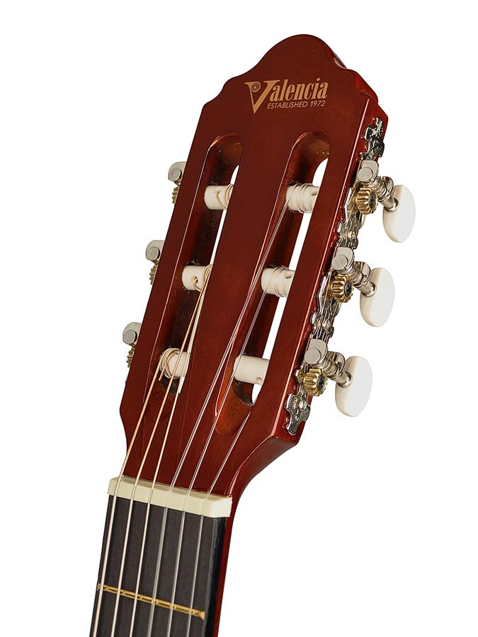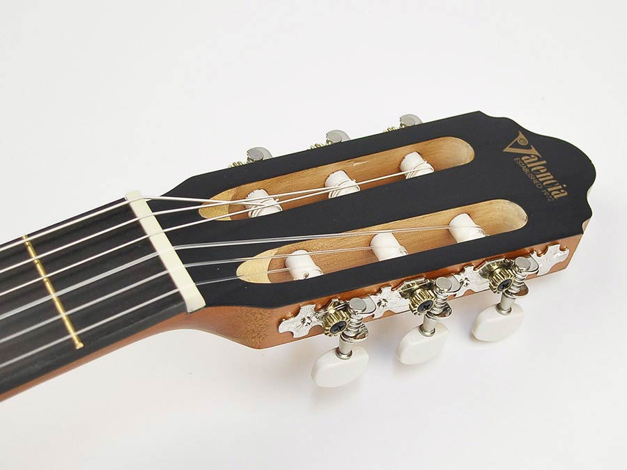 Gold machine heads with black button tuners give the Valencia Series 300 range a uniqueness not offered by any other brand. With a transparent, satin finish and stylish rosette decoration the Series 300 looks as good as it plays!