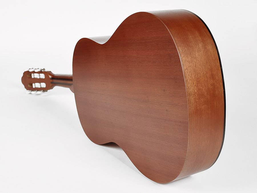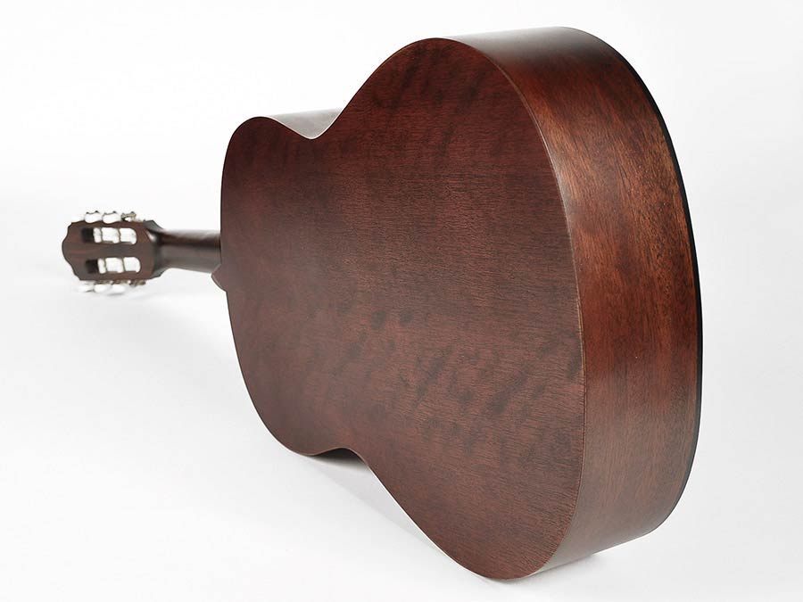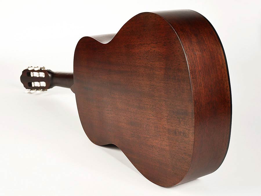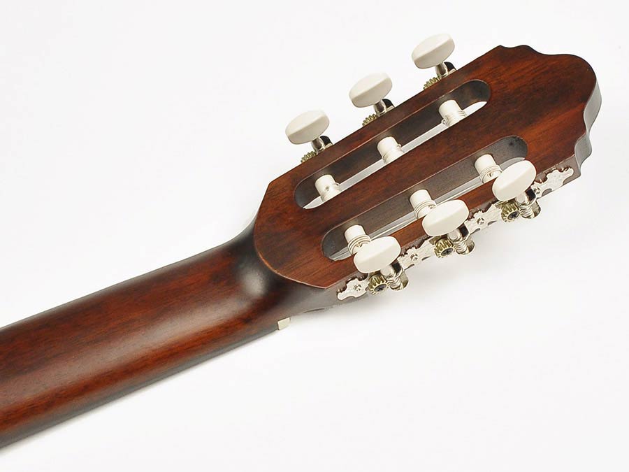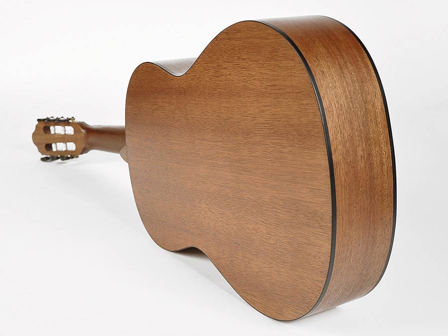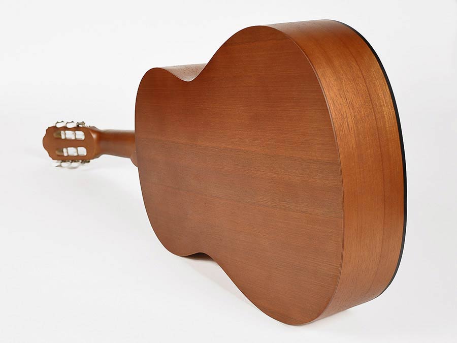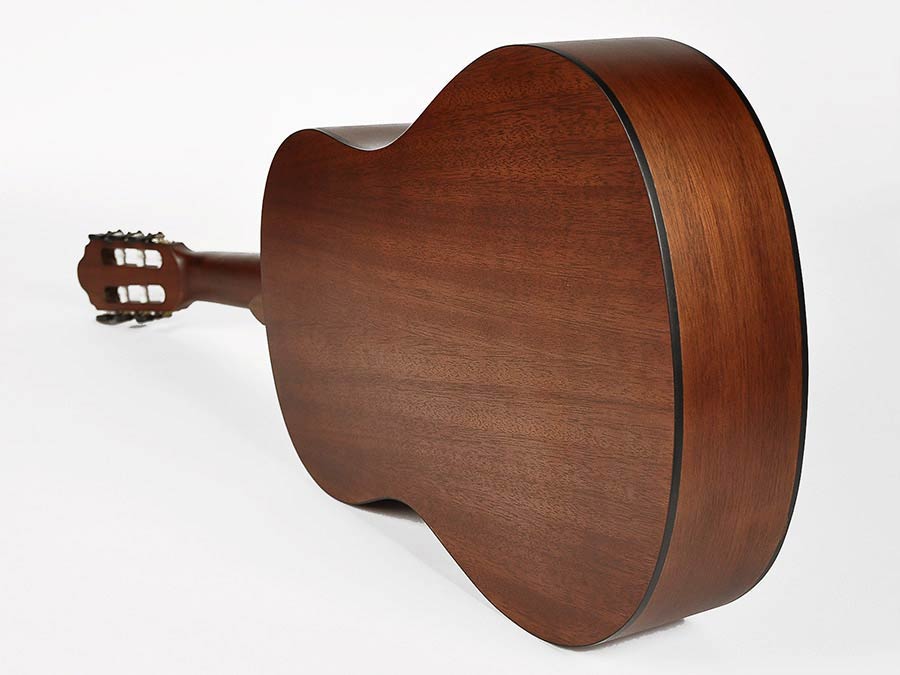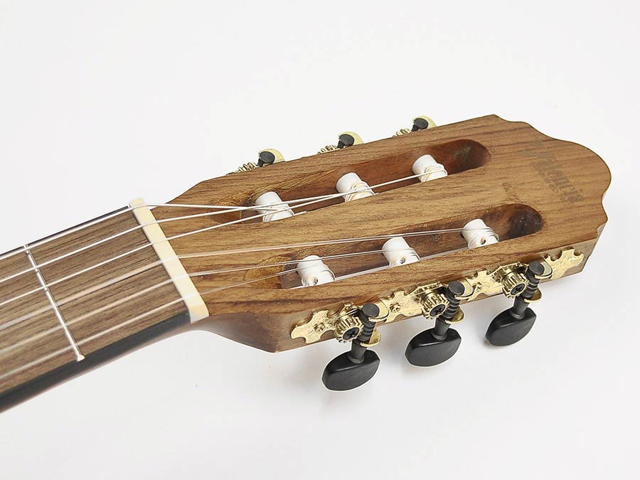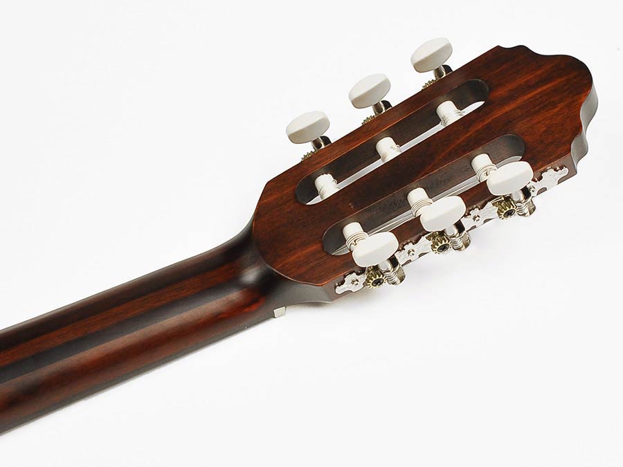 Top binding : ABS, 5 ply black/white Side binding : ABS, black Headstock veneer : teak Neck : mahogany Fingerboard : teak Neck binding : ABS, black Neck side dots : yes Neck shape : classical Neck heel : teak heel end Frets : 19 frets, nickel Bridge : teak Bridge saddle : Nubone XB, Canada Rosette decoration : “L’Hemisferic”, Valencia Machine heads : traditional, gold plated with black buttons Strings : made in USA Scale : 650mm Nut width : 52mm Finish : satin finish