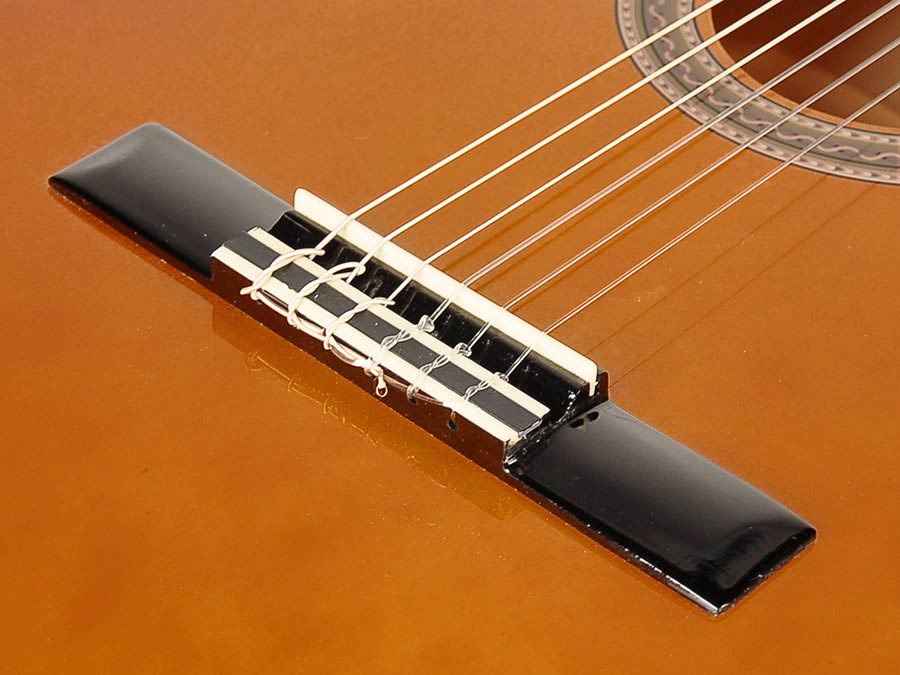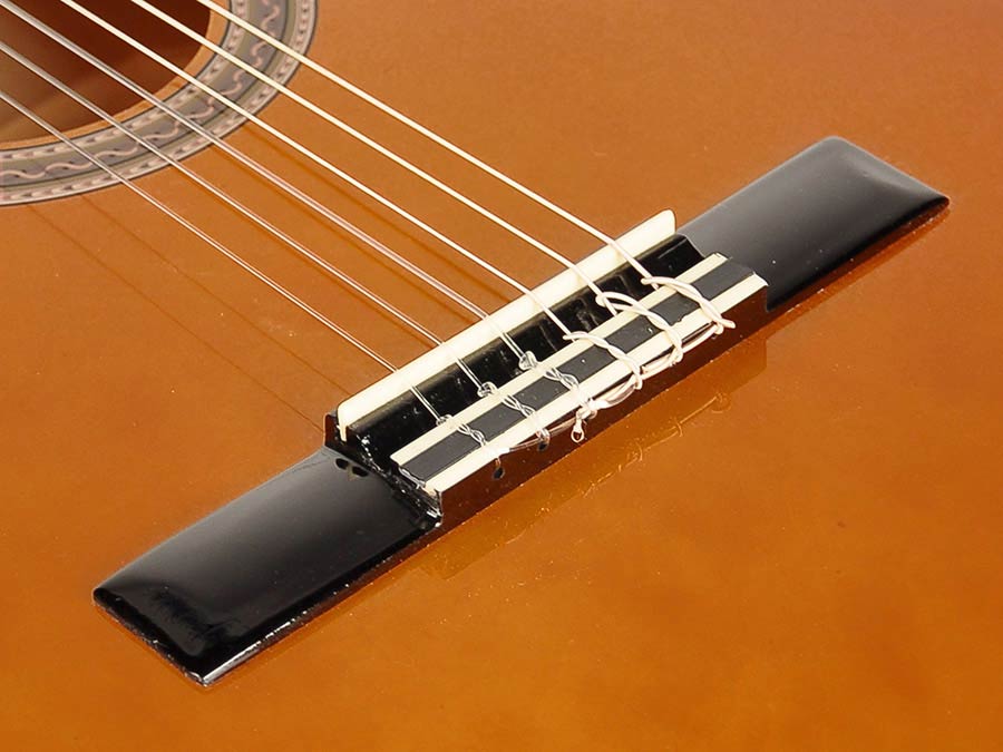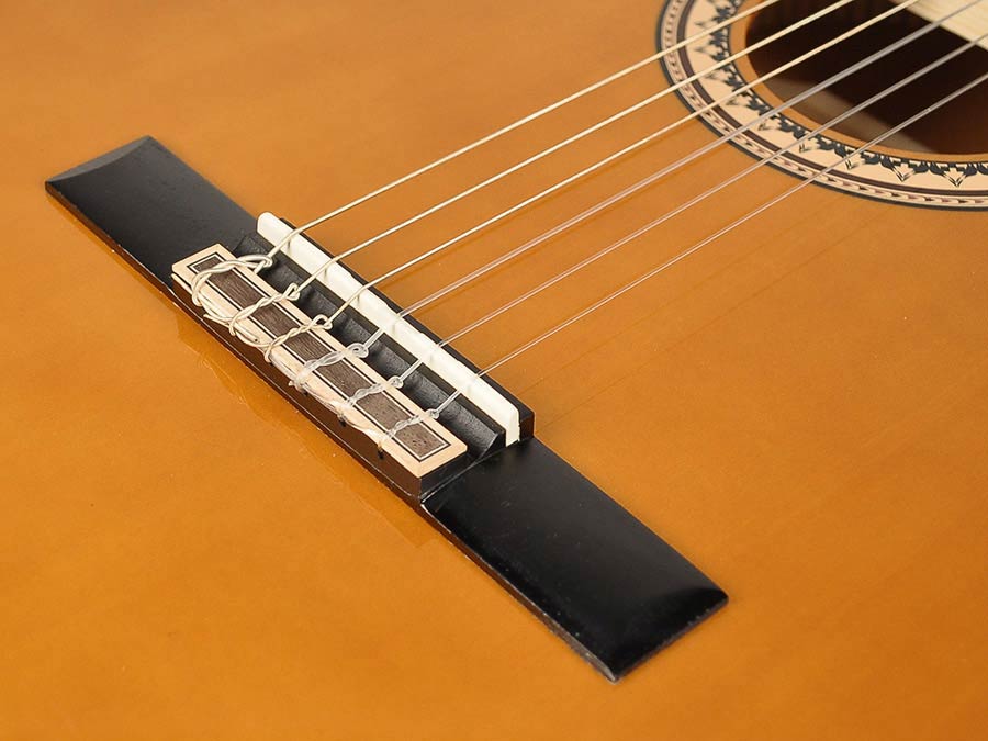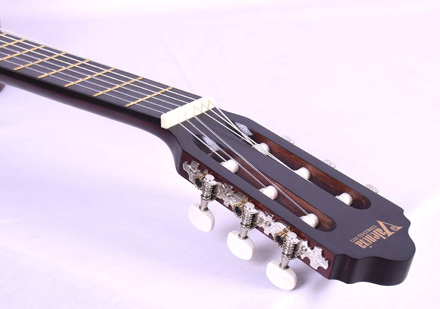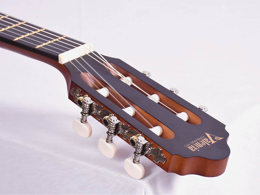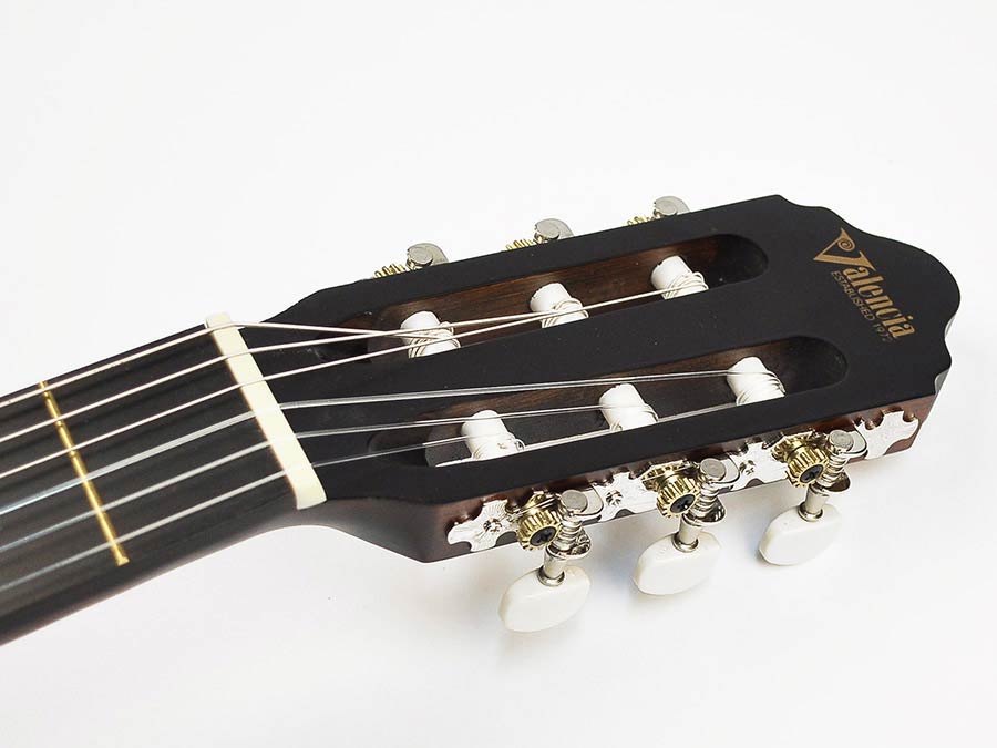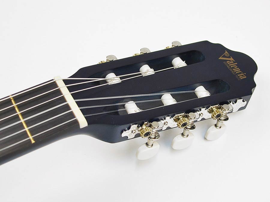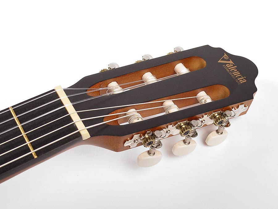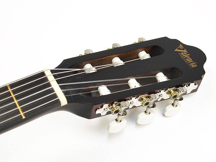 Neck binding : ABS, black Neck side Dots : yes Fret wire : 19 frets, brass Bridge : mahogany Bridge saddle : plastic Rosette decoration : Valencia 'Bat' motif Machine heads : traditional nickel plated with cream buttons Scale : 650mm Nut width : 52mm Finish : satin finish