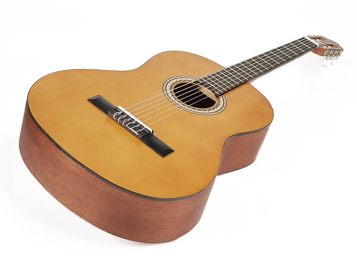 Specs: Body shape hybrid, classical guitar Size : 3/4 Full color packaging : yes Top : Sitka spruce Back & sides : Nato Top binding : ABS, black Neck : Jabon with rosewood reinforcing strips Fingerboard : ebonized mahogany Neck binding : ABS, black Neck side dots : yes Fret wire : 19 frets, brass Bridge : ebonized mahogany Bridge saddle : plastic, China Rosette decoration : Valencia 'Bat' motif Machine heads : nickel plated with cream buttons Scale : 580mm Nut width : 42mm Finish : satin