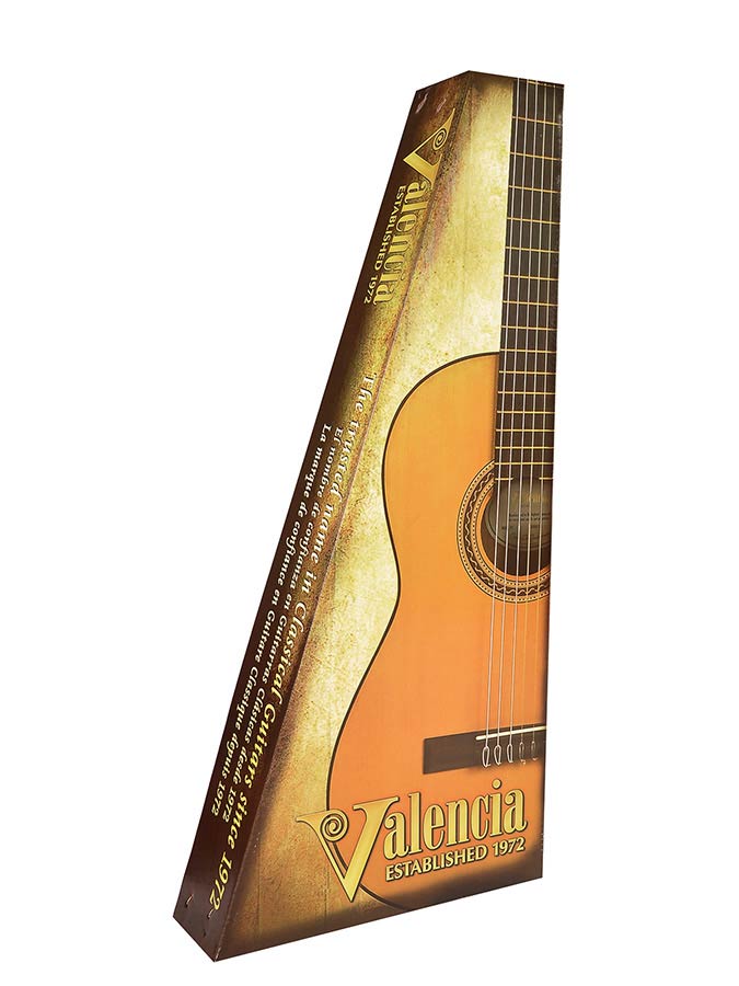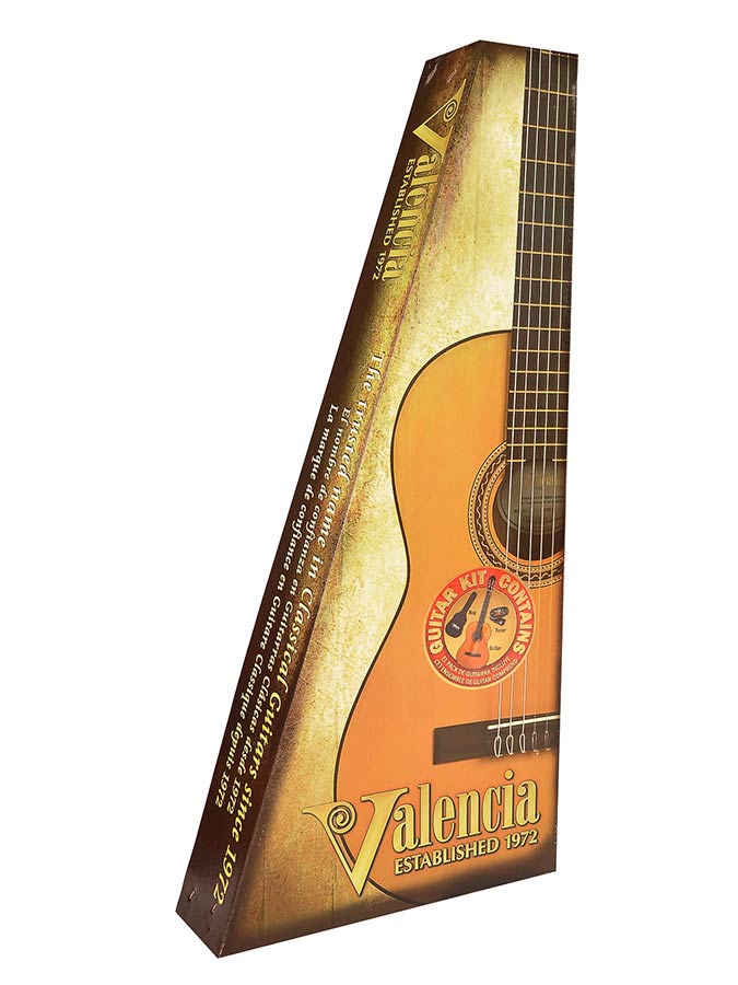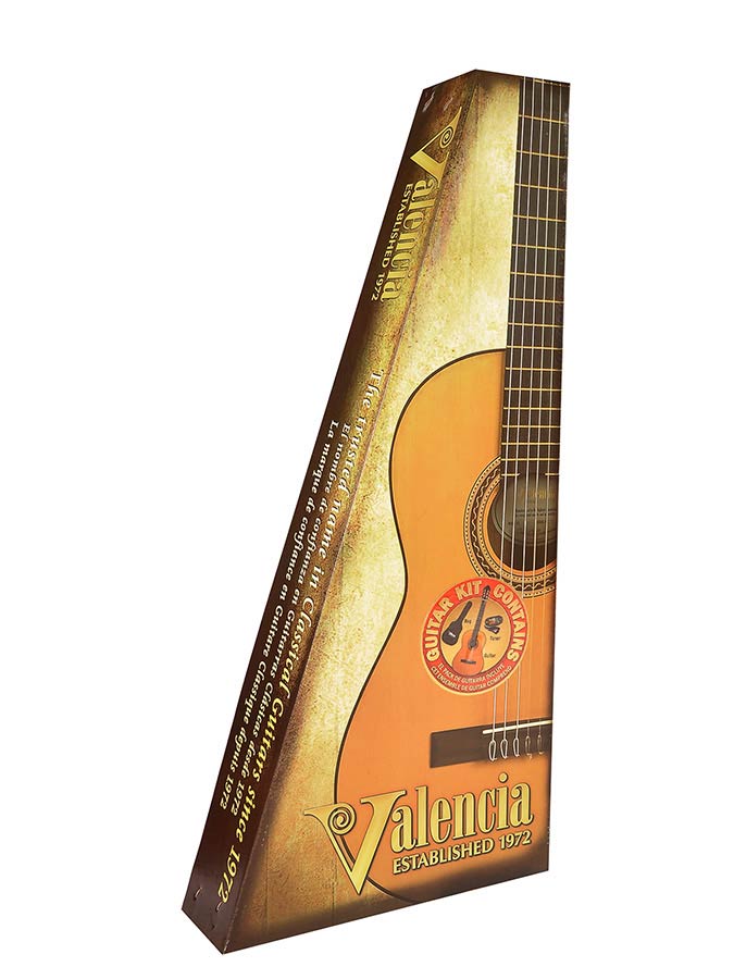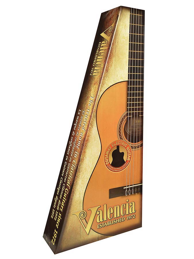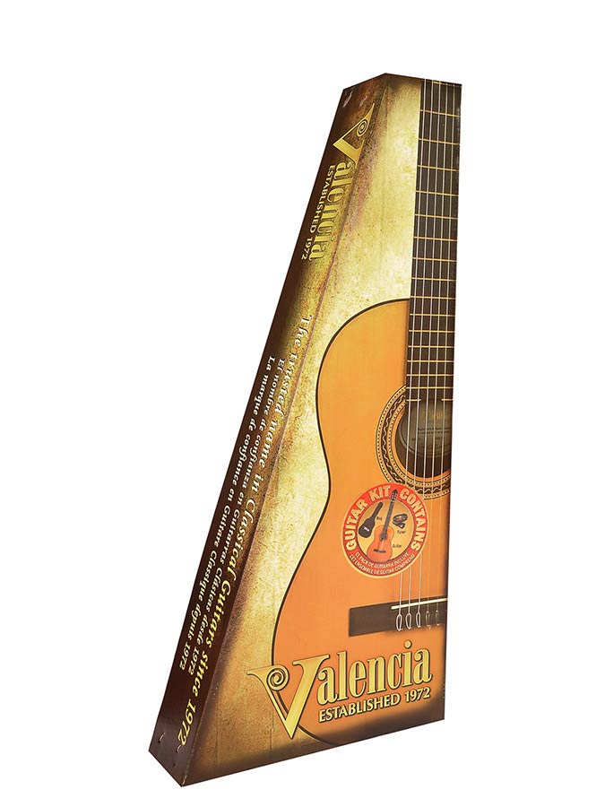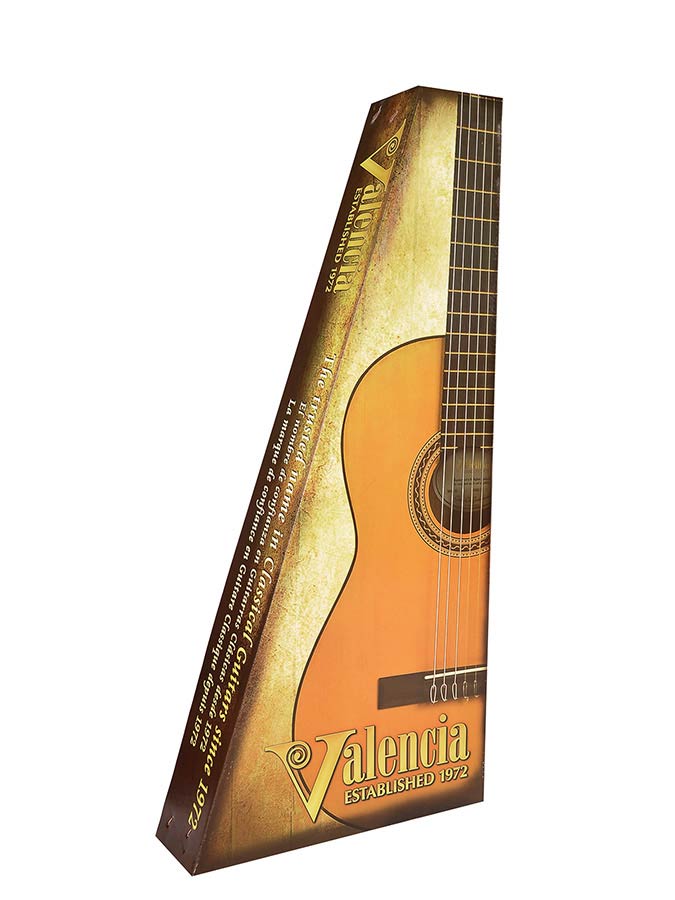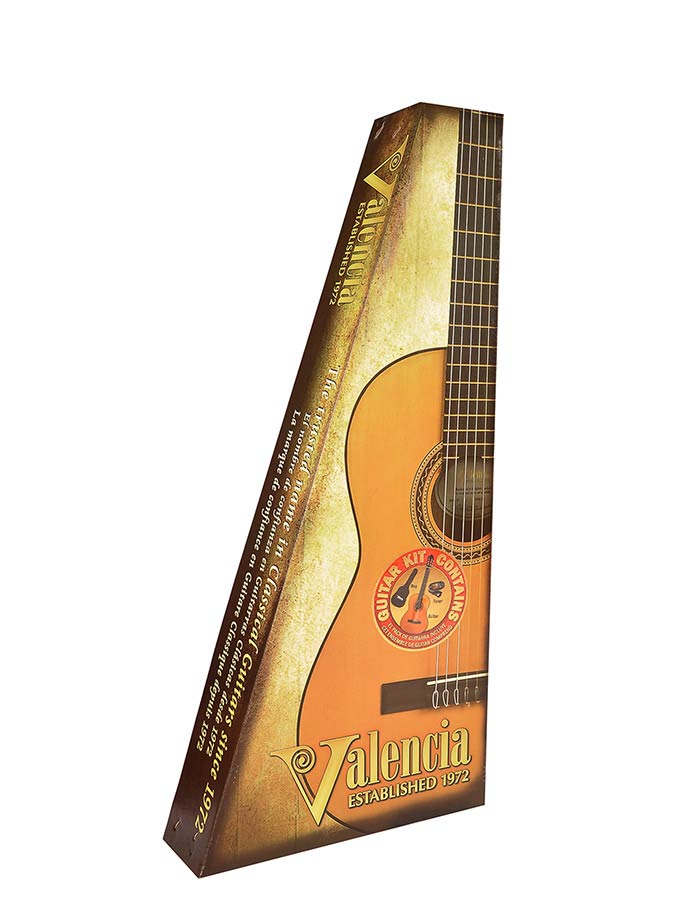 Gold machine heads with black button tuners give the Valencia Series 300 range a uniqueness not offered by any other brand. With a transparent, satin finish and stylish rosette decoration the Series 300 looks as good as it plays! Supplied complete with full-color, gift-box packaging.