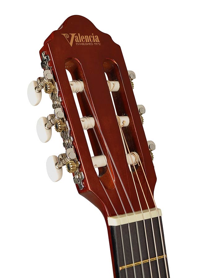 Traditional gold machine heads (with pearloid-button tuners), and a beautiful ABS center back strip round out the traditional look of the Valencia Series 400 range. The transparent, satin finish and tasteful appointments highlight the Series 400 understated good looks.