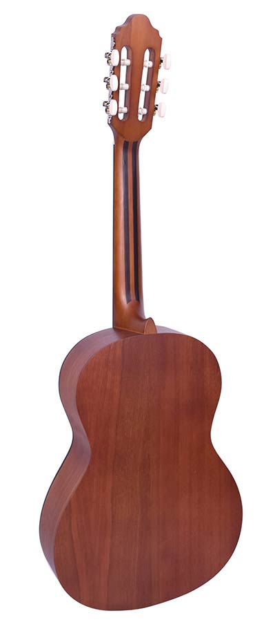 The Series 200 range is complemented by the introduction of our newly developed “Hybrid”, Thin-Neck model. Featuring a 45mm neck width (at nut) with 650mm (25 5/8”) scale length on a standard size body, the Hybrid is especially designed to accommodate the smaller hands of some beginner players. For superior stability and strength the neck of this model features two central reinforcing strips of rosewood installed longitudinally along the entire neck length. Specs: Top : sitka spruce Back & sides : nato Top binding : ABS – black – top side only Neck : jabon Fingerboard : ebonized mahogany Neck binding : ABS, black Neck side Dots : yes Fret wire : 19 frets, brass Bridge : mahogany Bridge saddle : plastic Rosette decoration : Valencia 'Bat' motif Machine heads : traditional nickel plated with cream buttons Scale : 650mm Nut width : 52mm Finish : satin finish